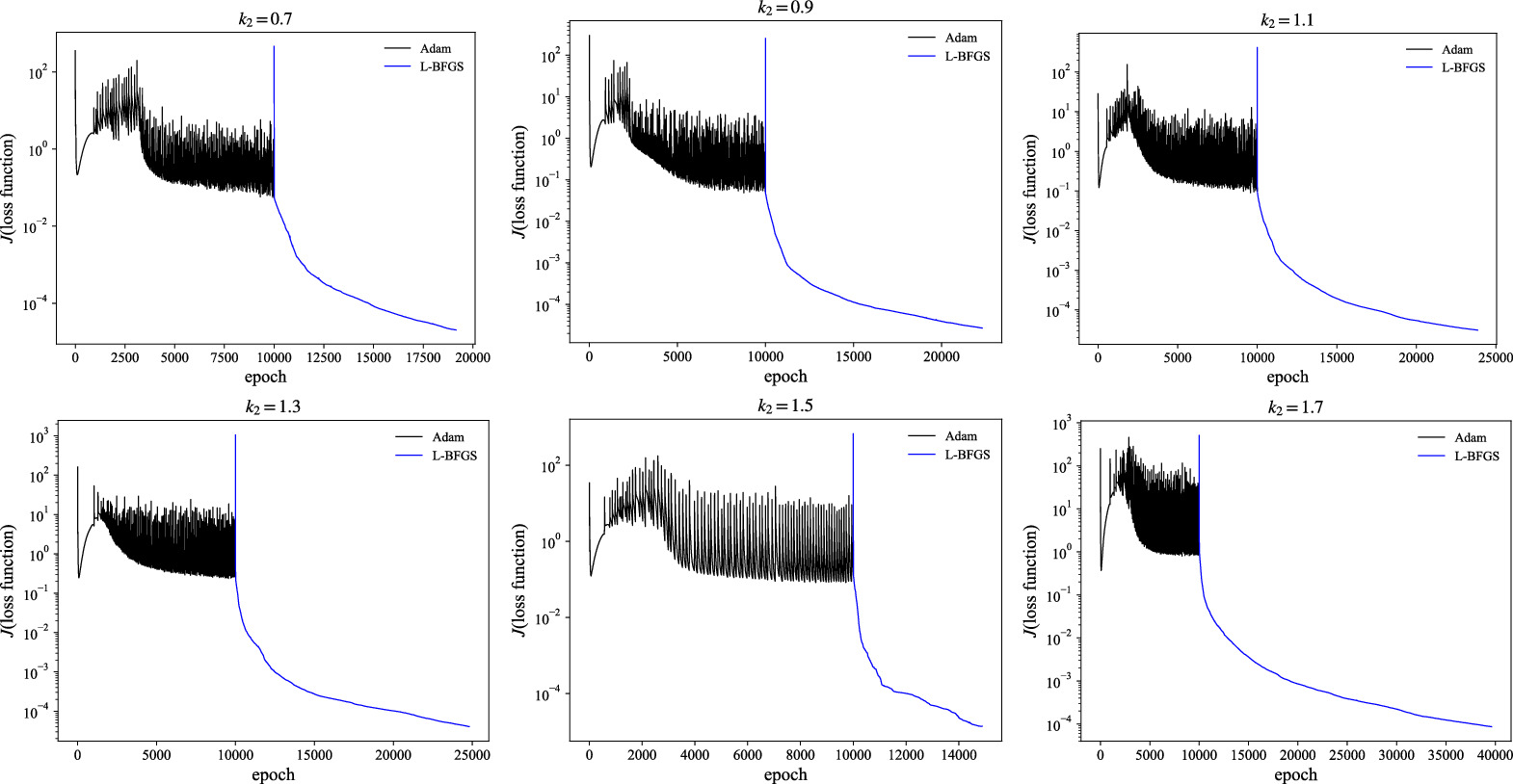 Figure 12. The six plots give the evolution of the loss function in the training process versus epoch by scanning parameter from k2 = 0.7 to k2 = 1.7 for the chasing-soliton case.