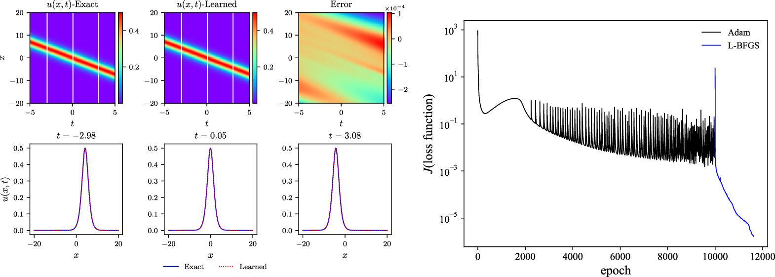 Figure 11. The comparisons of the exact and learned results are depicted similarly to those in the above figure 8, except that k = 1.7 in the chasing-soliton simulations.