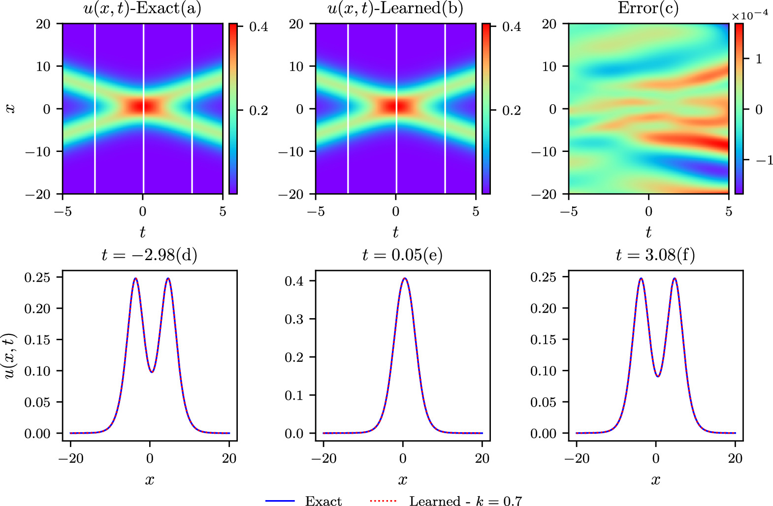 Figure 2. The upper three figures give the exact, learned, and pointwise error contours for k = 0.7 in the colliding-soliton simulations. Comparisons of the theoretical and the predicted results at three different time diagnosis points are shown in the lower three plots.