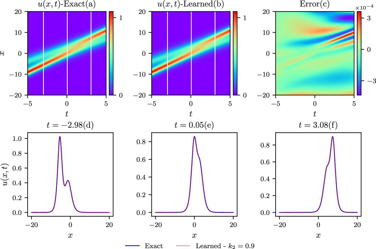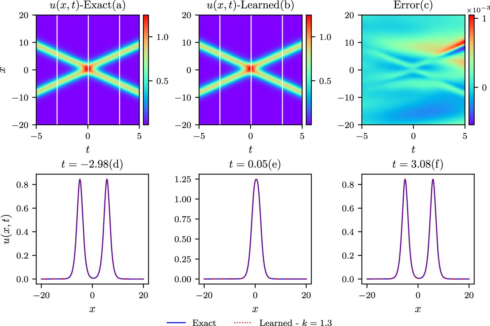 Figure 4. The comparisons of the exact and learned results are depicted similarly to those in the above figure 2, except that k = 1.3 in the colliding-soliton simulations.