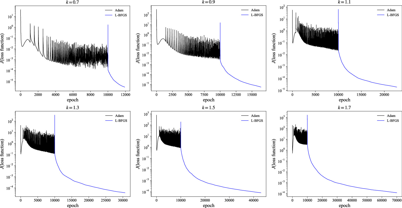 Figure 6. The six plots give the evolution of the loss function in the training process versus epoch by scanning parameter from k = 0.7 to k = 1.7 for the colliding-soliton case.
