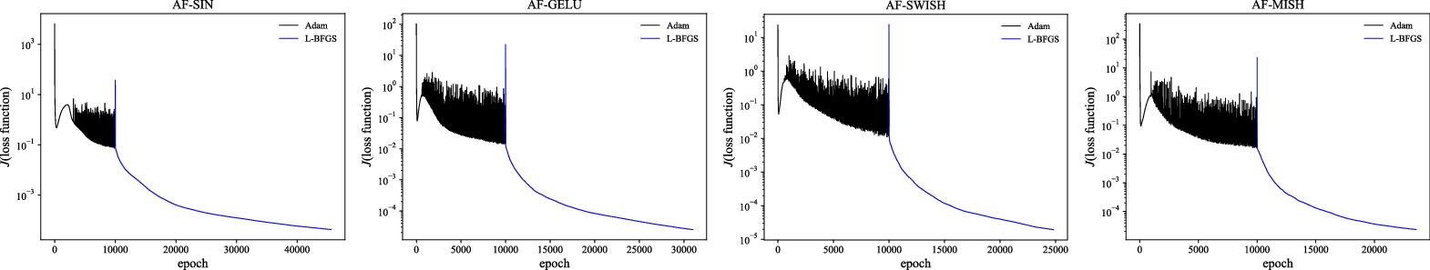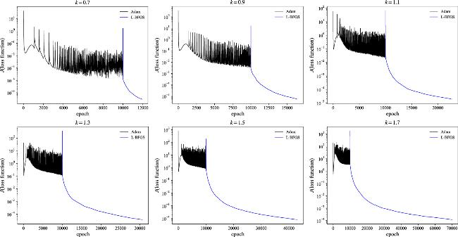 The current simulations employ the TANH activation function in the neural networks. In table 3, we provide descriptions and comparisons of the TANH, SIN (sinusoidal), GELU (Gaussian Error Linear Unit), SWISH, and MISH activation functions using the k = 1.1 case. The best relative L2-norm errors achieved are 1.03 × 10−2, 6.09 ×10−4, 6.35 × 10−4, and 7.33 × 10−4 for the SIN, GELU, SWISH, and MISH methods, respectively. The GELU, SWISH, and MISH activation functions achieve prediction accuracies comparable to that of the TANH function. In contrast, the sinusoidal activation functions demonstrate significantly poorer prediction precision. Additionally, the ReLU (Rectified Linear Unit) and Leaky ReLU activation functions fail to produce valid results or encounter NaN (Not a Number) issues in the current simulations. The training times for the SIN, GELU, SWISH, and MISH activation functions are approximately 2.37, 3.16, 1.86, and 1.77 times slower, respectively, compared to the TANH case. In figure 7, the evolutions of the loss function are shown, with Adam iterations set to 10 000, consistent with the above setup. The GELU, SWISH, and MISH activation functions achieve similar final loss values, as illustrated in the upper right figure of figure 6. However, despite having comparable training epochs to the TANH case, the SWISH and MISH activation functions exhibit slower per-epoch training times, resulting in longer total training durations. These comparisons confirm that the TANH activation function is efficient for the current simulations.