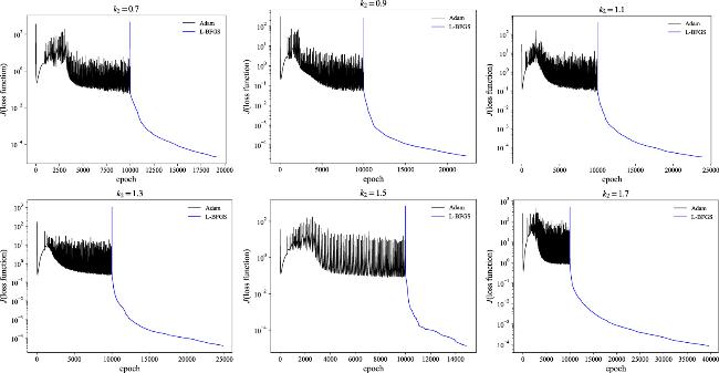 In figure 6, the loss function evolutions are given with the k1 and k2 parameters setups from table 2 by the Adam optimizer plus the L-BFGS algorithm with the IPINNs model. The total number of training epochs increases from the k = 0.7 parameter setting to the k = 1.7 case in the current simulations. Since the neural network architecture, the number of collocation points and IB points, and the physics information are the same, the total training time is closely related to the optimizer steps. The number of the Adam optimizer iteration is set as 10 000, so the increasing time comes from the L-BFGS iterations. The learning speed is slower for the narrower width of the colliding-soliton for the L-BFGS algorithm. Each epoch consumes more time due to the second-order derivatives of the loss function with the L-BFGS algorithm compared to the Adam optimizer, with the latter relying only on the first-order derivatives.
