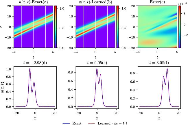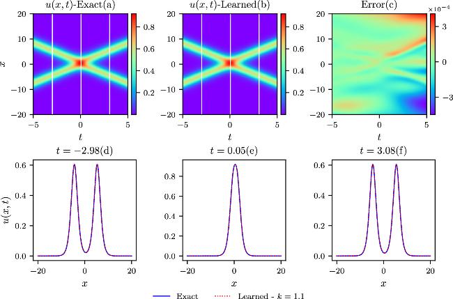 Figure 3. The comparisons of the exact and learned results are depicted similarly to those in the above figure 2, except that k = 1.1 in the colliding-soliton simulations.