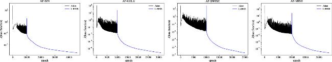 Figure 7. The three plots illustrate the evolution of the loss function using sinusoidal, SWISH, and MISH activation functions for the k2 = 1.1 colliding-soliton case.