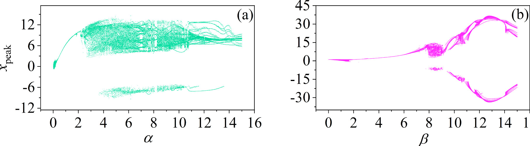 Figure 10. Bifurcation diagram of the neuron circuit corresponding to variations in α and β. The parameters are set as follows: (a) $\beta $ = 9; (b) α = 10. The other parameter: m0 = −1, m1 = 0.9, $\omega $ = 3.5, d = 1, A = 8.8, and Ic = 8. The initial conditions (0.1, 0.1, 0.1, 2). |