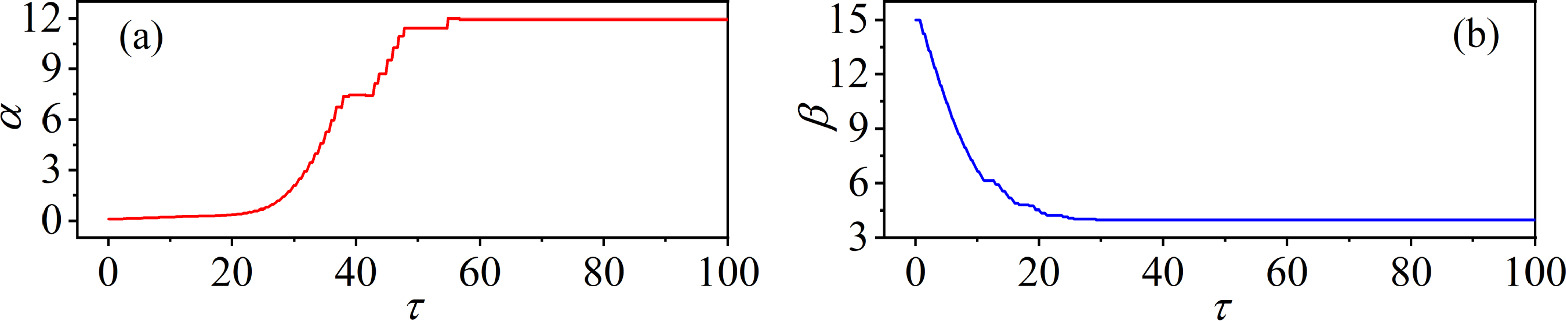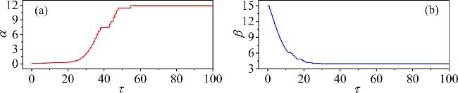 Figure 12. Targeted modulation of the field energy in the capacitor and inductor corresponding to their time-varying parameters $\alpha (\tau )$ and $\beta (\tau )$. The parameters: (a)${\alpha }_{0}$ = 0.01, ${\sigma }_{1}$ = 0.3, ${\varepsilon }_{1}$ = 4.5; (b)${\beta }_{0}$ = 15, ${\sigma }_{2}$ = −0.1, ${\varepsilon }_{2}$ = 30. Other parameters: m0 = −1, m1 = 0.9, $\omega $ = 3.5, A = 8.8, Ic = 8, d = 1. The initial conditions: (0.1, 0.1, 0.1, 2). |