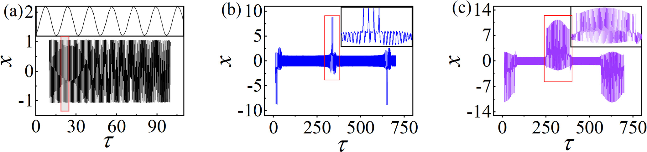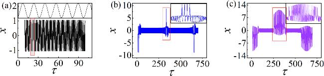 Figure 3. Time sequences of membrane potentials under varying A (the small image is a partial enlargement of the area with red borders). Corresponding A: (a) A = 5; (b) A = 7; (c) A = 9. Other parameters: $\alpha $ = 10, $\beta $ = 9, Ic = 8, m0 = −1, m1 = 0.9, ω = 0.01, d = 1. The initial values: (0.1, 0.1, 0.1, 2). |