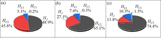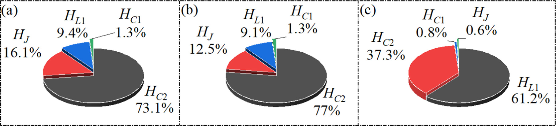 Figure 4. The proportion of field energy in each component to the Hamiltonian energy under different light illumination conditions, (a) A = 5, (b) A = 7, (c) A = 9; Other parameters: $\alpha $ = 10, $\beta $ = 9, Ic = 8, m0 = −1, m1 = 0.9, ω = 0.01, d = 1. The initial values are set to: (0.1, 0.1, 0.1, 2). |