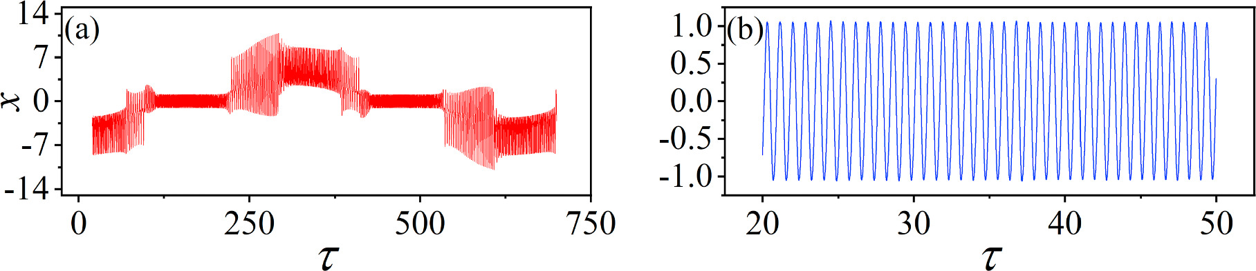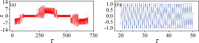 Figure 8. Time series of membrane potential for different Josephson junction current parameters Ic. (a) Ic = 6; (b) Ic = 11. Other parameters: α = 10, β = 9, m0 = −1, m1 = 0.9, $\omega $ = 0.01, A = 8.8, d = 1. The initial values (0.1, 0.1, 0.1, 2). |