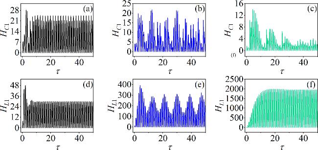 Figure 11. Time evolution of the electric field energy stored in C1 and the magnetic field energy stored in L1 corresponding to different values as: (a) α = 2, (b) α = 4, (c) α = 11; (d) β = 4, (e) β = 8.5, (f) β = 13.5. For (a)–(c) β = 9; for (d)–(f) α = 10. Other parameters: m0 = −1, m1 = 0.9, $\omega $ = 3.5, A = 8.8, and Ic = 8, d = 1. The initial conditions are set to (0.1, 0.1, 0.1, 2). |