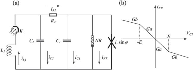 Figure 1. (a) Double membrane, magnetic sensitive, light sensitive neuron model constructed by Chua’s circuit. (b) I-V characteristic curve of the Chua’s diode, it’s a nonlinear resistance (NR). |