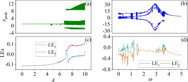 Figure 2. Bifurcation and LEs’diagrams of the uK’s A and ω in the neuron model. The parameters corresponding to the diagrams: (a), (c) ω = 0.01; (b), (d) A = 8.8. Other parameters: $\alpha $ = 10, $\beta $ = 9, Ic = 8, m0 = −1, m1 = 0.9, d = 1. The initial values: (0.1, 0.1, 0.1, 2). |