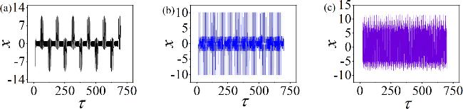 Figure 5. Time sequences of membrane potentials under different ω, with: (a) ω = 0.05; (b) ω = 0.5; (c) ω = 3.5. Other parameters: $\alpha $ = 10, $\beta $ = 9, Ic = 8, m0 = −1, m1 = 0.9, A = 8.8, d = 1. The initial values are set to: (0.1, 0.1, 0.1, 2). |