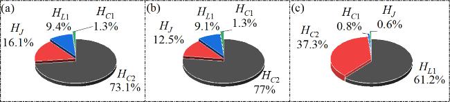 Figure 6. Proportions of energy in various components by different ω. with(a) ω = 0.05; (b) ω = 0.5; (c) ω = 3.5. Other parameters: $\alpha $ = 10, $\beta $ = 9, Ic = 8, m0 = −1, m1 = 0.9, A = 8.8, d = 1. The initial values: (0.1, 0.1, 0.1, 2). |