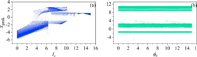 Figure 7. Fixed external illumination, the bifurcation of Josephson current parameter Ic and the initial value of ${\phi }_{0}$. The parameters corresponding to: (a) ${\phi }_{0}$ = 2; (b) Ic = 8. Other parameters: a = 10, b = 9, m0 = −1, m1 = 0.9, $\omega $ = 0.01, A = 8.8, d = 1. The initial values (0.1, 0.1, 0.1). |