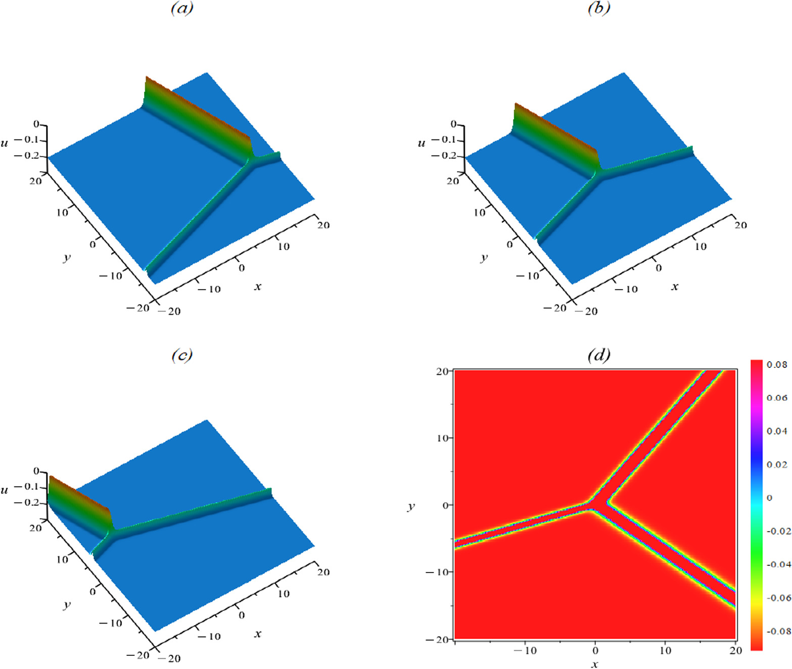 Figure 3. The resonant soliton expressed by equation (29) with equation (37), equation (38) and the parameter selections {a1, a2, a3, a4, a6, α, β, l1, k1, k2, ω1, ω2} = $\{1,\frac{1}{2},1,1,1,1,-3,1,2,2,1,-\frac{2}{5}\}$ (a) the resonant soliton stereogram when t = − 30, (b) the resonant soliton stereogram when t = 0, (c) the resonant soliton stereogram when t = 30, (d) the overhead view of the resonant soliton when t = 0.