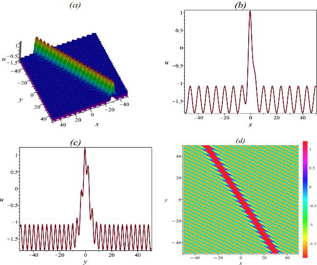 Figure 1. The bright soliton periodic wave, as represented by equation (35) under the appropriate selection of parameters {a1, a2, a3, a4, a5, a6, l2, k1, k2, ω2, μ, ν} = $\{2,9,1,1,6,1,1,1,\frac{1}{2}$,$-\frac{1}{2},\frac{2}{25}$,$-\frac{19}{10}\}$ (a) the soliton periodic wave stereogram in the (x, y) plane when t = 0, (b) the waveform graph parallel to the x-axis, (c) the waveform graph parallel to the y-axis, (d) the overhead view of the soliton periodic wave in the (x, y) when t = 0.