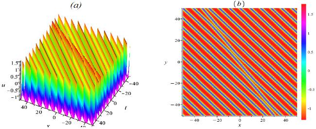 Figure 2. The phase shift phenomenon of a soliton on a cnoidal wave background expressed by equation (35) with the parameter selections {a1, a2, a3, a4, a5, a6, l2, k1, k2, ω2, μ, ν} = $\{1,2,1,1,1,1,1,1,\frac{1}{2}$, $\frac{9}{10},-1\}$ (a) the soliton periodic wave stereogram when t = 0, (b) the overhead view of the soliton periodic wave when t = 0.