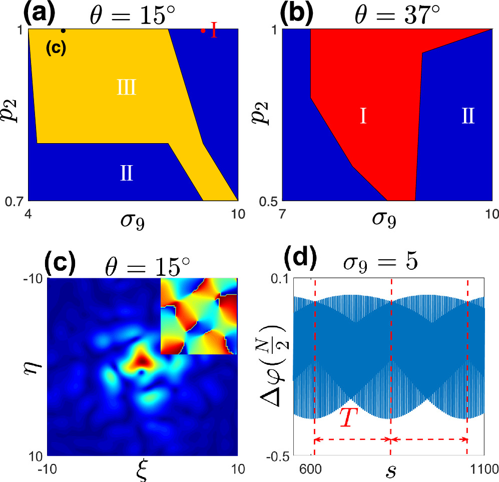 Figure 11. (a–b) When θ = 15° and θ = 37°, the various solitons exist different regions under varying secondary sub-lattice depths p2 and Gaussian amplitude σ9. (c) For θ = 15° p2 = 0.8 and σ9 = 5, a top-down view of the square periodic dynamic bright vortex soliton is presented. The inset shows the phase profiles of the bright vortex. The solution correspond to points (c) in diagrams (a). (d) shows the changes in ${\rm{\Delta }}\varphi (\frac{N}{2})$ of the periodic dynamic soliton during its evolution at s = 12000. And T = 223. |