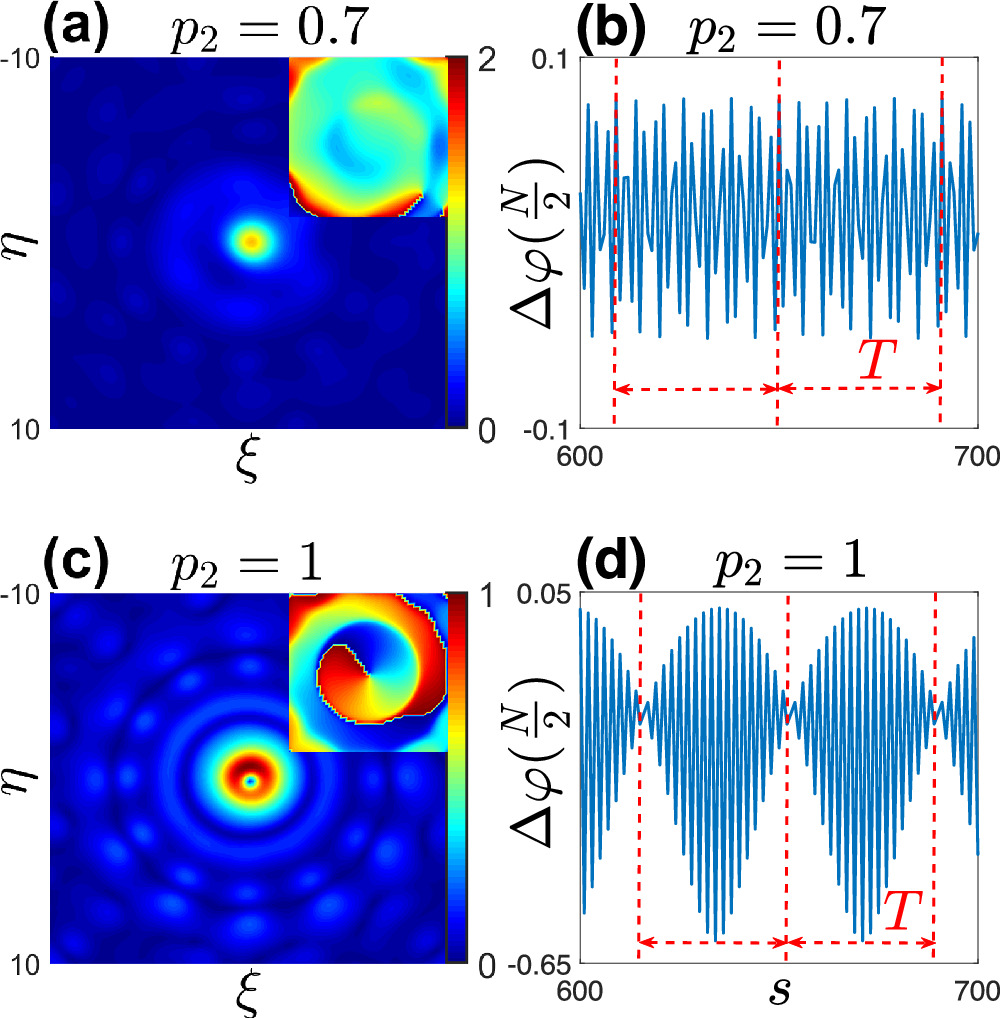 Figure 15. (a), (c) show two periodic dynamic bright vortices, while p2 = 1 and σ9 = 8. The insets show the phase profiles of the bright vortices. These solutions correspond to points (f) and (g) in figure 13(a). (c) also correspond to points (g) in figure 13(b). (b) shows the changes in ${\rm{\Delta }}\varphi (\frac{N}{2})$ of the periodic dynamic vortex (a) during its evolution at s = 12000. And T = 22. (d) shows the changes in ${\rm{\Delta }}\varphi (\frac{N}{2})$ of the periodic dynamic vortex (c) during its evolution at s = 12000. And T = 15. |