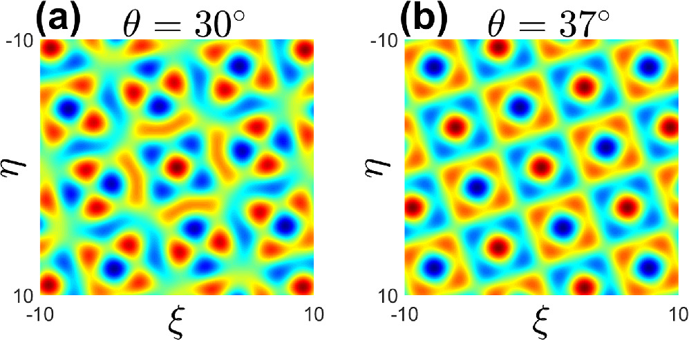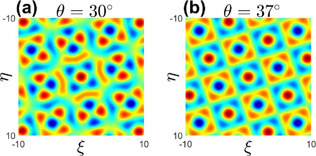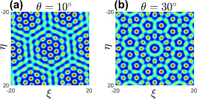 Figure 12. (a–b) The hexagonal Moiré lattice is formed by two sub-lattices with equal lattice depths (p1 = p2 = 1), each rotated by angles θ = 10° and θ = 30°, respectively, to create an external potential field. |