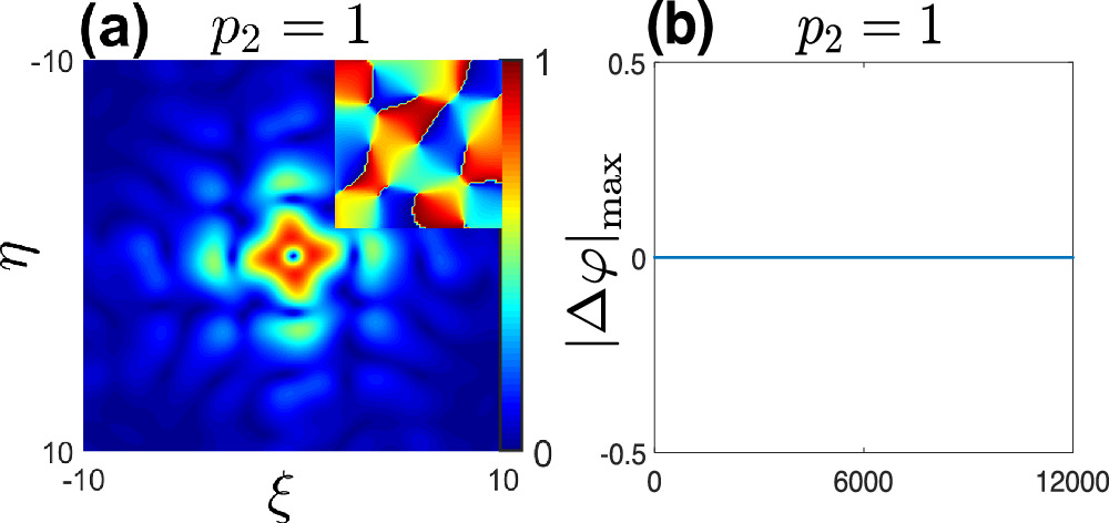 Figure 4. (a) For θ = 15° and p2 = 1, a top-down view of the square bright vortex soliton solution is presented, accompanied by an inset that illustrates the phase profiles of the square bright vortex soliton solution. (b) shows the changes in ${\left|{\rm{\Delta }}\varphi \right|}_{{\rm{\max }}}$ of the square bright vortex soliton solution during its evolution at s = 12000. This bright vortex result corresponds to the middle (h) point in figure 3(a). |