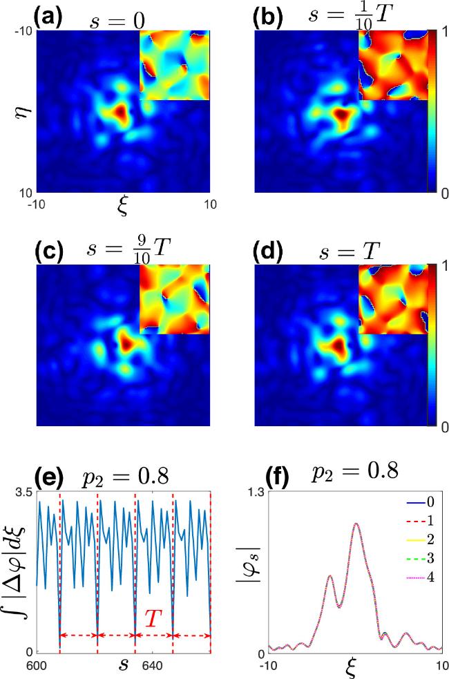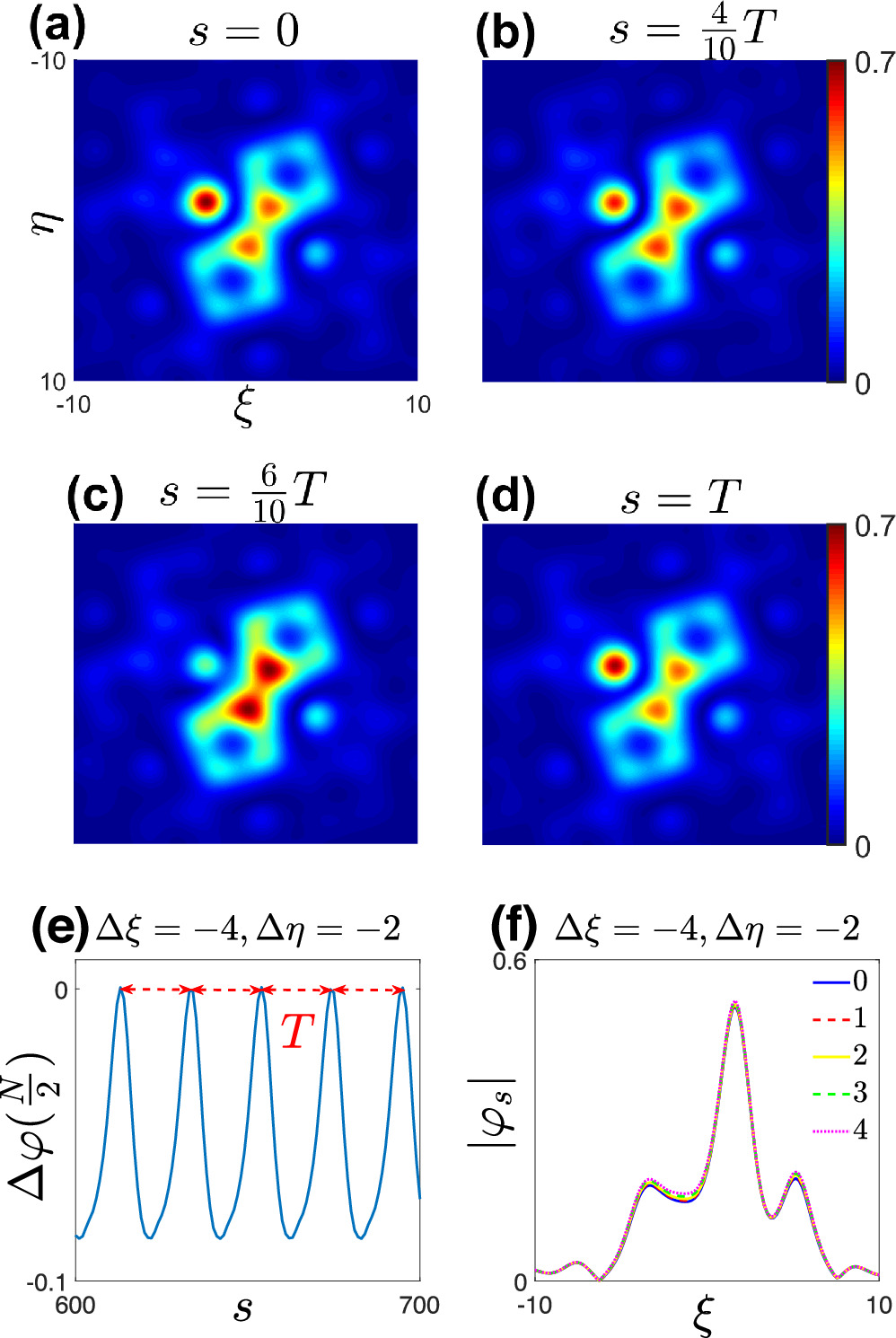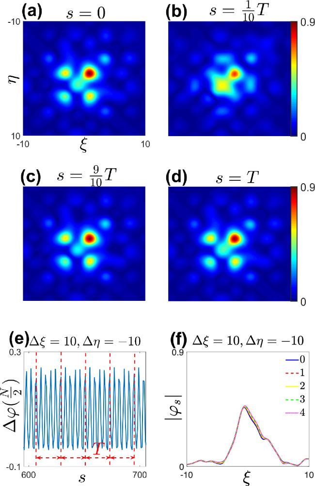 Figure 7. (a)–(d) When the rotation angle θ = 37°, a three-peak periodic dynamic soliton at the displacement from the external potential center Δξ= -4 and Δη= -2. And they show the morphology of the bright soliton at different times within one period. (e) shows the changes in ${\rm{\Delta }}\varphi (\frac{N}{2})$ of the soliton during its evolution at s = 12000. (f) shows the soliton profile along the ξ direction at a time s = 0, compared with the soliton profiles after one, two, three, and four periods. And T = 20. This periodic dynamic soliton corresponds to the (e) point in figure 6(b). |