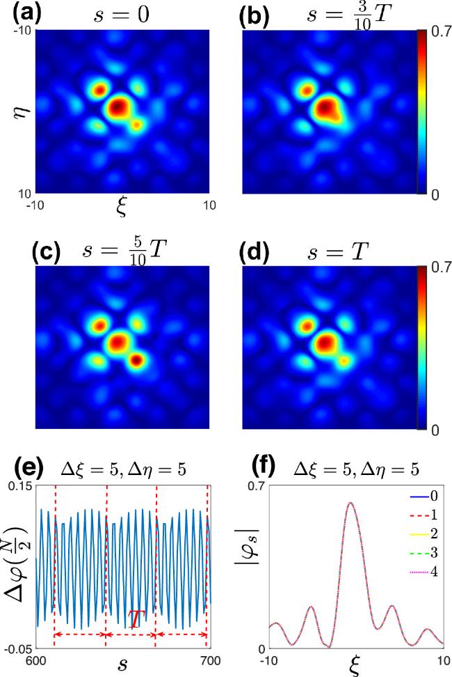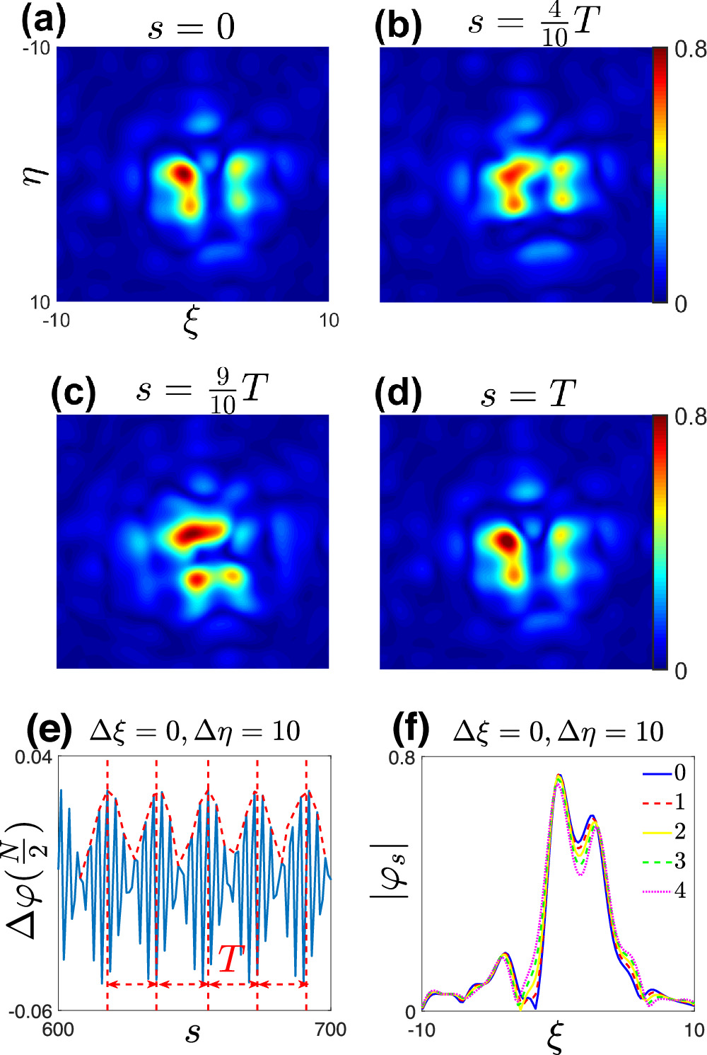 Figure 10. (a)–(d) When the rotation angle θ = 45°, a five-peak periodic dynamic soliton at the displacement from the external potential center Δξ = 10 and Δη = −10. And they show the morphology of the bright soliton at different times within one period. (e) shows the changes in ${\rm{\Delta }}\varphi \left(\frac{N}{2}\right)$ of the soliton during its evolution at s = 12000. (f) shows the soliton profile along the ξ direction at a time s = 0, compared with the soliton solution profiles after one, two, three, and four periods. And T = 22. |