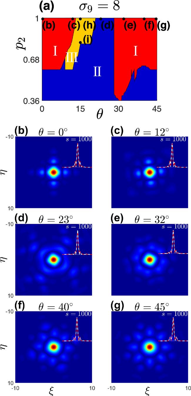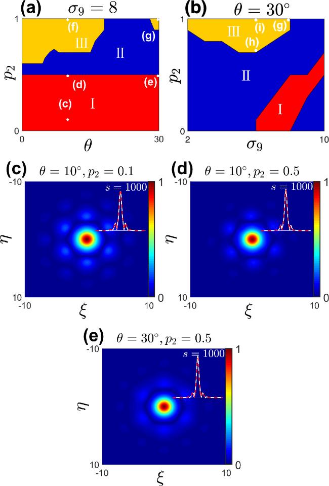 Figure 13. (a-b) When σ9 = 8 and θ = 30°, the various solitons exist different regions. (c-d) When θ = 10° and σ9 = 8, the top-view of the soliton at different p2 is shown, and the insets depicts a comparison of soliton profiles before and after soliton evolution. These solutions correspond to points (c) and (d) in diagram (a). (e)When θ = 30°, σ9 = 8 and p2 = 0.5, the top-view of the soliton is shown, and the insets depicts a comparison of soliton profiles before and after soliton evolution. The solution correspond to points (e) in diagram (a). |