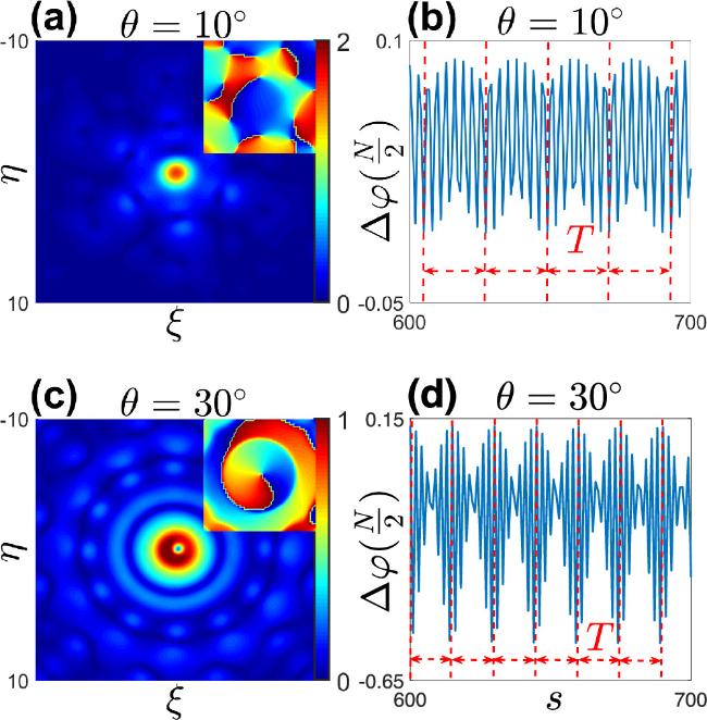Figure 14. (a), (c) show two periodic dynamic bright vortices, while θ = 30° and σ9 = 6. The insets show the phase profiles of the bright vortices. These solutions correspond to points (h) and (i) in figure 13(b). (b) shows the changes in ${\rm{\Delta }}\varphi (\frac{N}{2})$ of the periodic dynamic vortex (a) during its evolution at s = 12000. And T = 41. (d) shows the changes in ${\rm{\Delta }}\varphi (\frac{N}{2})$ of the periodic dynamic vortex (c) during its evolution at s = 12000. And T = 37. |