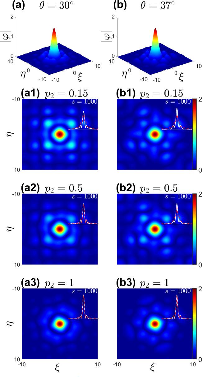 Figure 2. (a-b) When p1 = p2 = 1, there are stable soliton solutions under the Moiré lattice external potential fields at rotation angles θ = 30° and θ = 37°. (a1-a3) show top-down views of soliton solutions were depicted at the same angle θ = 30°, with respective values of p2 = 0.15 (a1), p2 = 0.5 (a2), and p2 = 1 (a3). Under this parameter setting, the insets depict a comparison of soliton profiles before and after soliton evolution (where η = 0). The solid white line represents the soliton profile before evolution, while the red dotted line represents the soliton profile after evolution, with an evolution duration of s = 1000. (b1-b3) follow the same format. |
