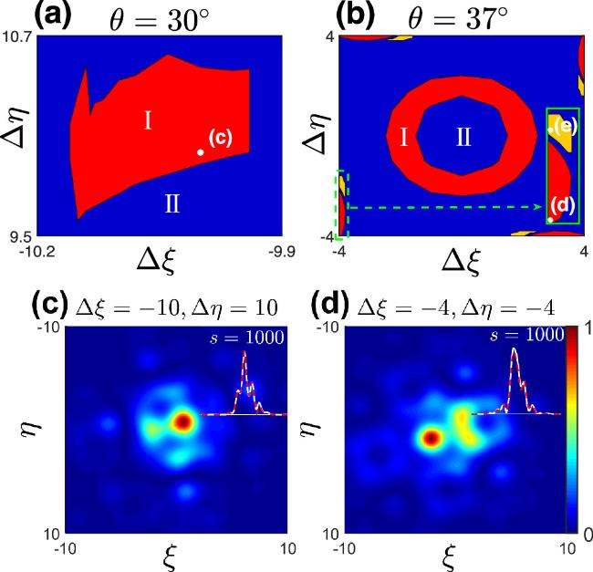 Figure 6. (a) When θ = 30°, in the vicinity of the region where the displacement from the external potential center is Δξ = − 10 and Δη = 10, statically stable solitons exist in the red region I. (b) When θ = 37°, in the vicinity of the region where the displacement from the external potential center is ${\rm{\Delta }}\xi \in \left[-4:\,4\right]$ and ${\rm{\Delta }}\eta \in \left[-4:\,4\right]$, statically stable solitons exist in the red Region I and periodic dynamic solitons exist in the orange Region. The inset shows an enlarged view of the area enclosed by the green dotted line. (c) When Δξ − 10 and Δη = 10, the statically stable soliton is shown, and the inset depicts a comparison of soliton profiles before and after soliton evolution. The solution correspond to points (c) in diagrams (a). (d) When Δξ = − 4 and Δη = − 4, the statically stable soliton is shown, and the inset depicts a comparison of soliton profiles before and after soliton evolution. The solution correspond to points (d) in diagrams (b). |