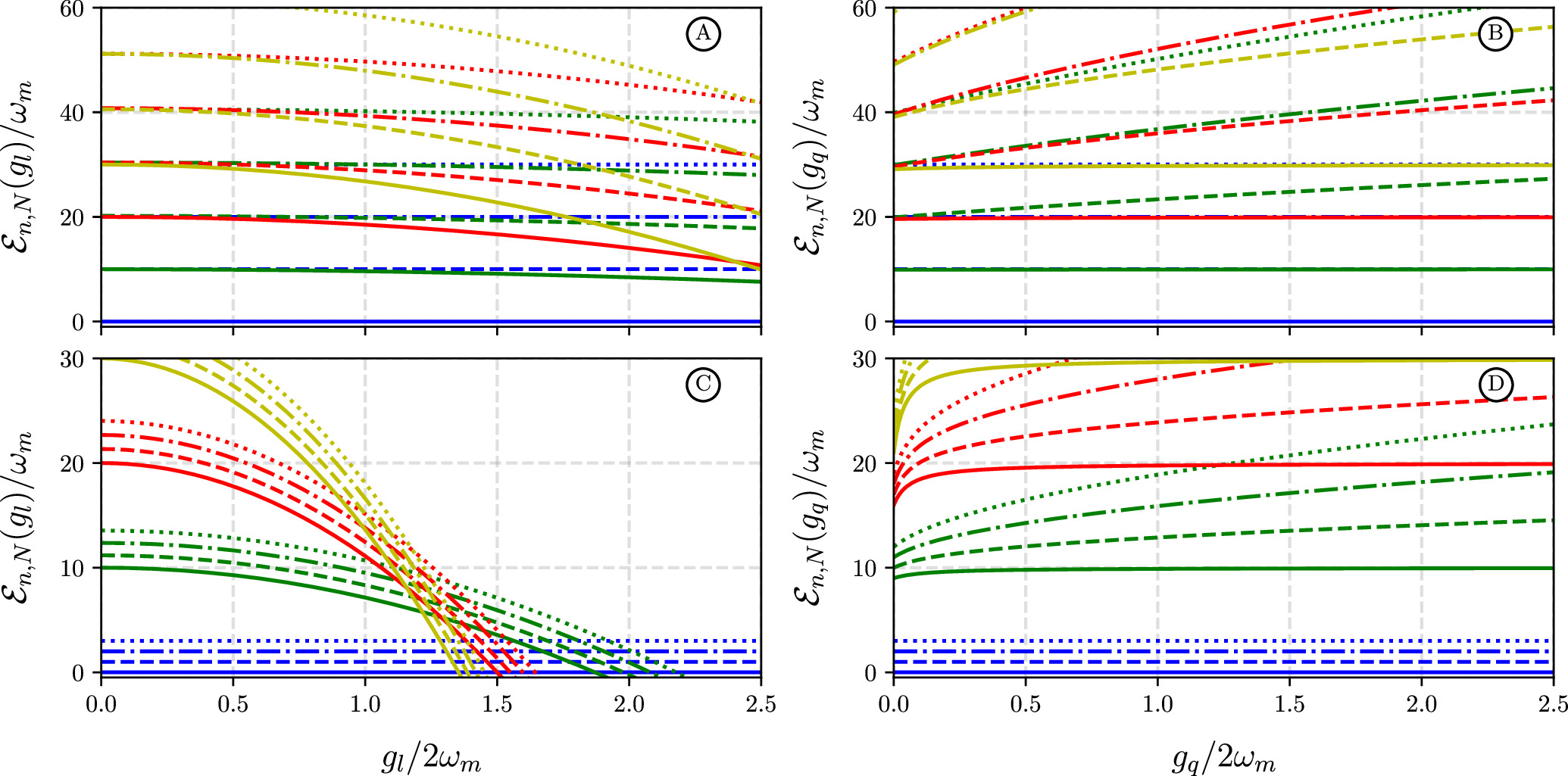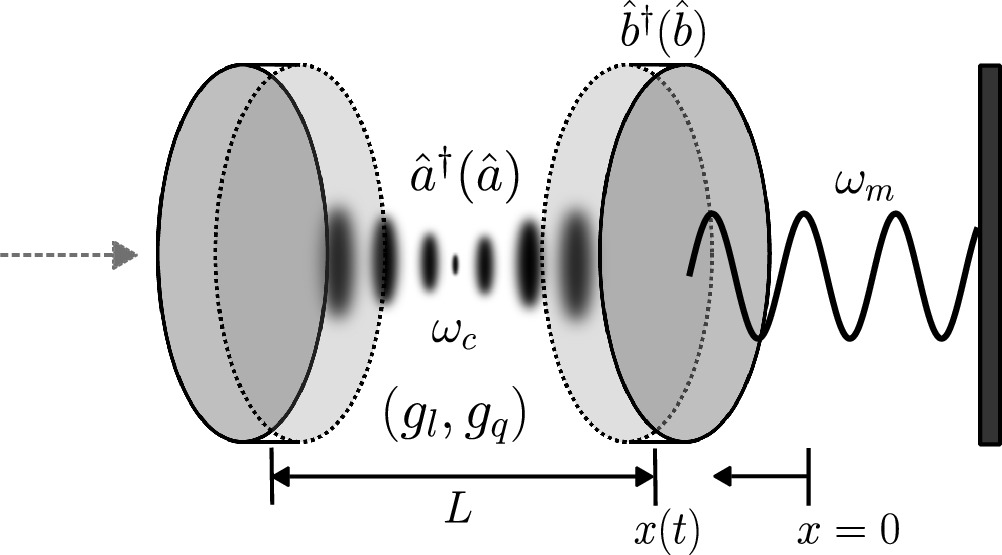 At first, the intention to include the quadratic term responds to the fact that the preservation of harmonic behavior when just linear coupling is considered, has an upper bound; thus, higher regimes preserving the semi-positiveness of the eigenvalues, needs the quadratic and upper orders in the interaction. On the other hand, including dephasing over dissipation is intended to represent, for example, results where gravitational decoherence can be mimicked with pure dephasing optomechanical systems [