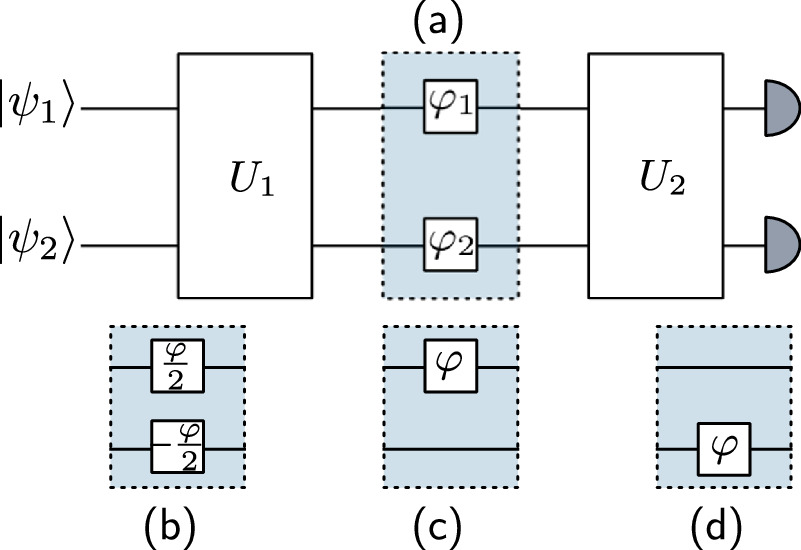 For an optical interferometer, the quantum state typically goes through another unitary process U2, e.g., a beam splitter, before the final measurement. The unitary operator U1 and U2 are independent of the phase parameters φ1 and φ2. The output state ∣ψ〉 is given by $| \psi \rangle ={U}_{2}{U}_{{\varphi }_{1}{\varphi }_{2}}{U}_{1}| {\psi }_{0}\rangle $.