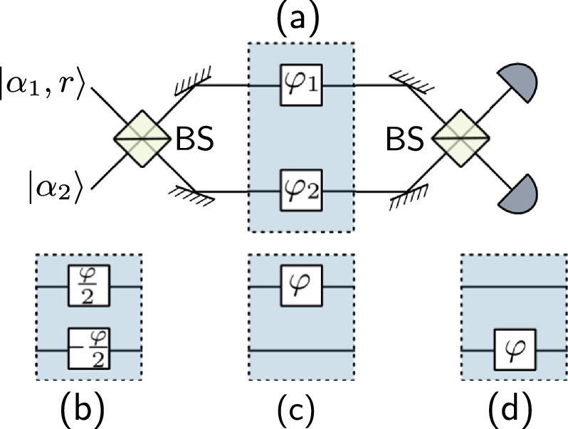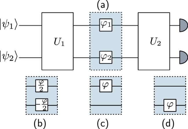 Figure 1. Different parametrization models of the MZI. (a) Two-parameter estimation model. (b)–(d) Various single-parameter estimation models.
