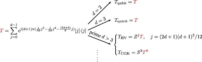 Our T-gates generalize and unify various T-gates in the literature including the qubit T-gate Tqubit [1], the qutrit T-gate Tqutrit [5], the Howard–Vala T-gates THV [5], as well as the Cui–Gottesman–Krishna T-gates TCGK [23].