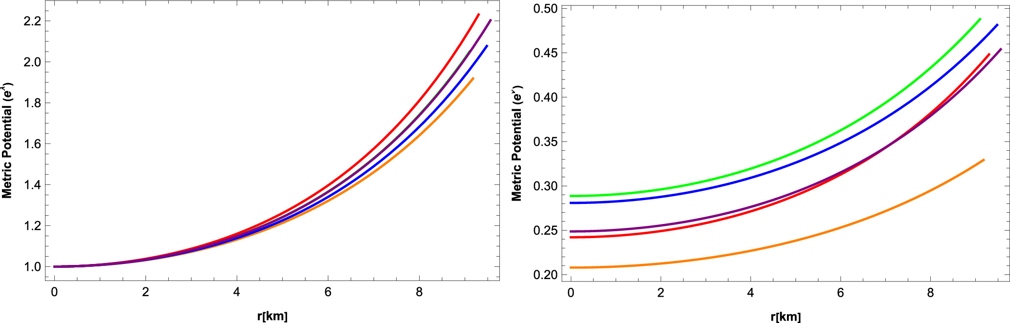 Metric potentials are essential for characterizing the properties of spacetime. Figure 1 shows that the functions gtt = eν and grr = eλ produce singularity-free plots, adhering to all necessary constraints, such that eν(r=0) = eK and eλ(r=0). These results indicate that the metric potentials behave regularly and satisfy the required boundary conditions at the center of the star.