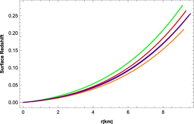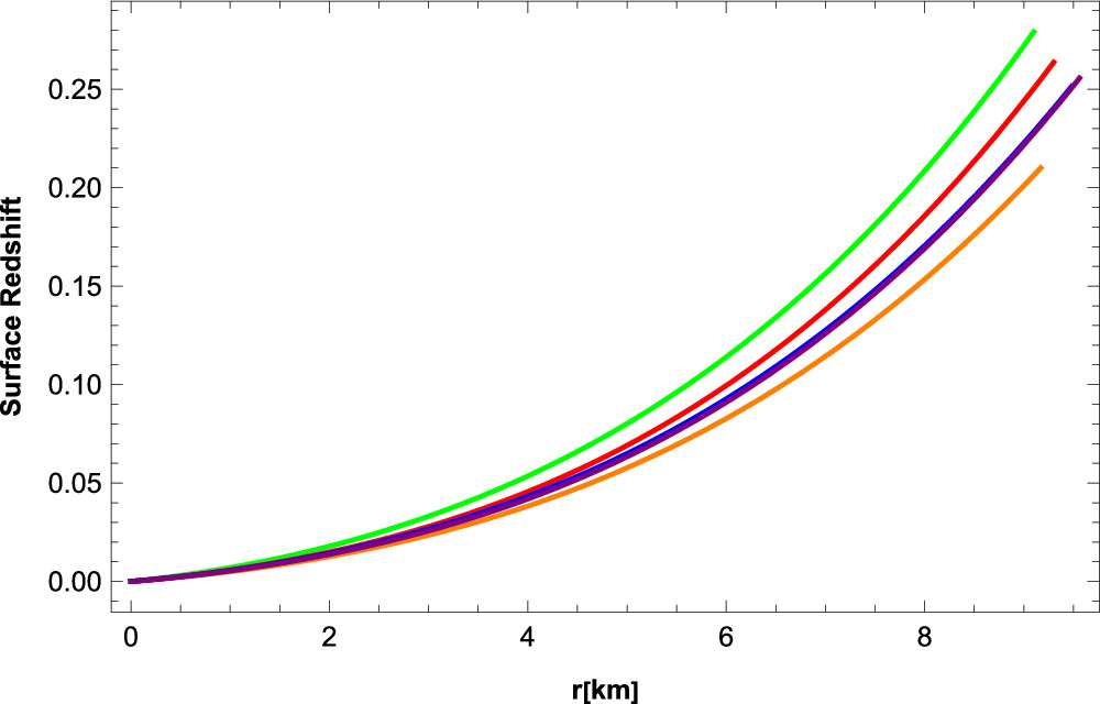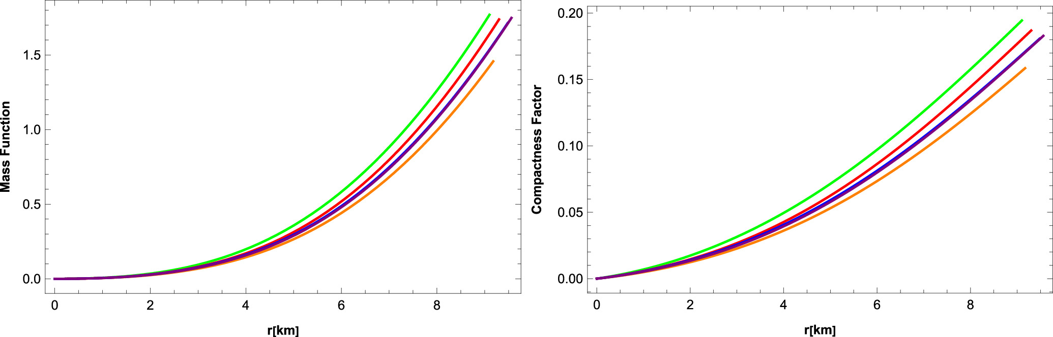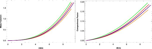 Figures 2 and 3 illustrate a consistent upward trend in the mass function, compactness parameter, and surface redshift. This behavior reflects the expected increase in these quantities as we move outward from the center of the star, supporting the overall consistency and viability of the model.
