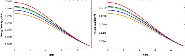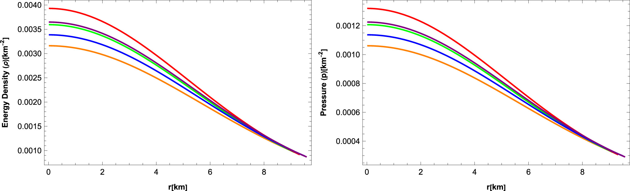 Here, we investigate the graphical behaviors of density and pressure components in the context of the RGT model. Figure 4 reveals the graphical analysis of ρ is maximum at the center of the star. The trends of density indicate a significant level of compactness in the core of the star, indicating that our model is achievable for the area outside the core. A similar graphical behavior of p may be observed in figure 4, which is maximum at the core and decreases when we move towards the boundary of the star.