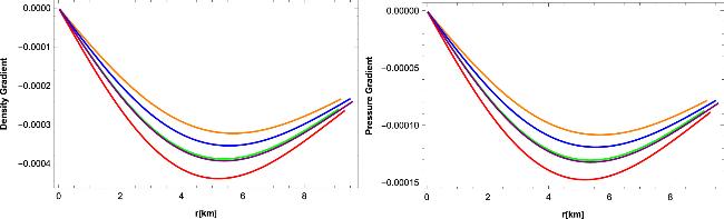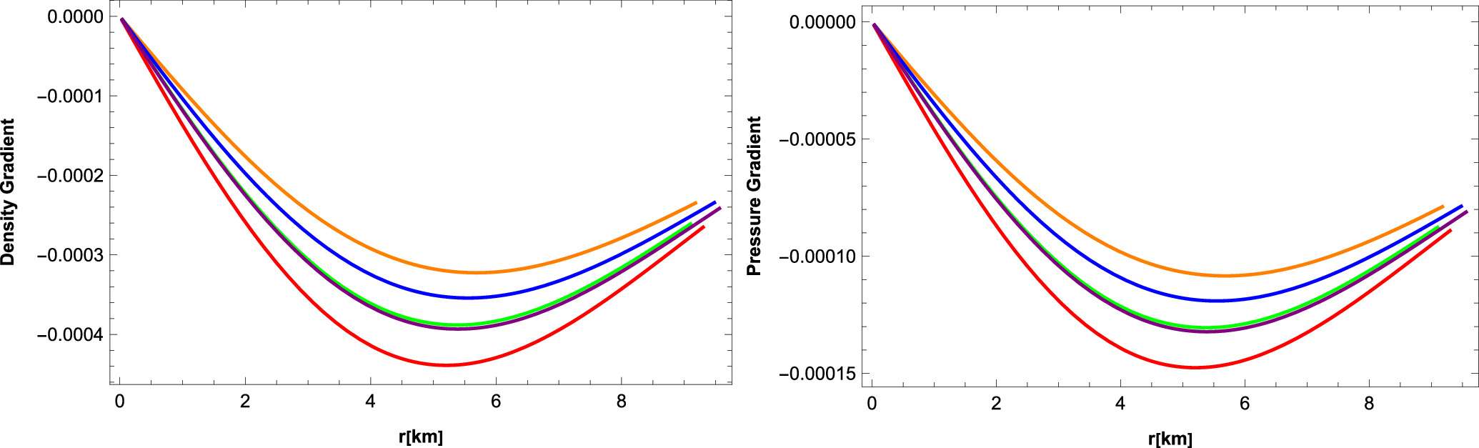 The graphical trends of the density (ρ) and pressure (p) in the evaluated model are shown in figure 4. These plots indicate that both ρ and p reach their maximum values at the core and gradually decrease towards the boundary. Additionally, figure 5 presents the graphical analysis of the gradients of ρ and p, which are zero at the core and then become negative, exhibiting a decreasing behavior as one moves outward from the center of the star.