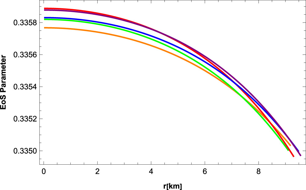 The graphical representation of the EoS parameter satisfies the condition 0≤ϖ≤1, ensuring that the stellar model behaves appropriately, which is demonstrated in figure 6.