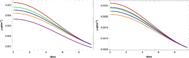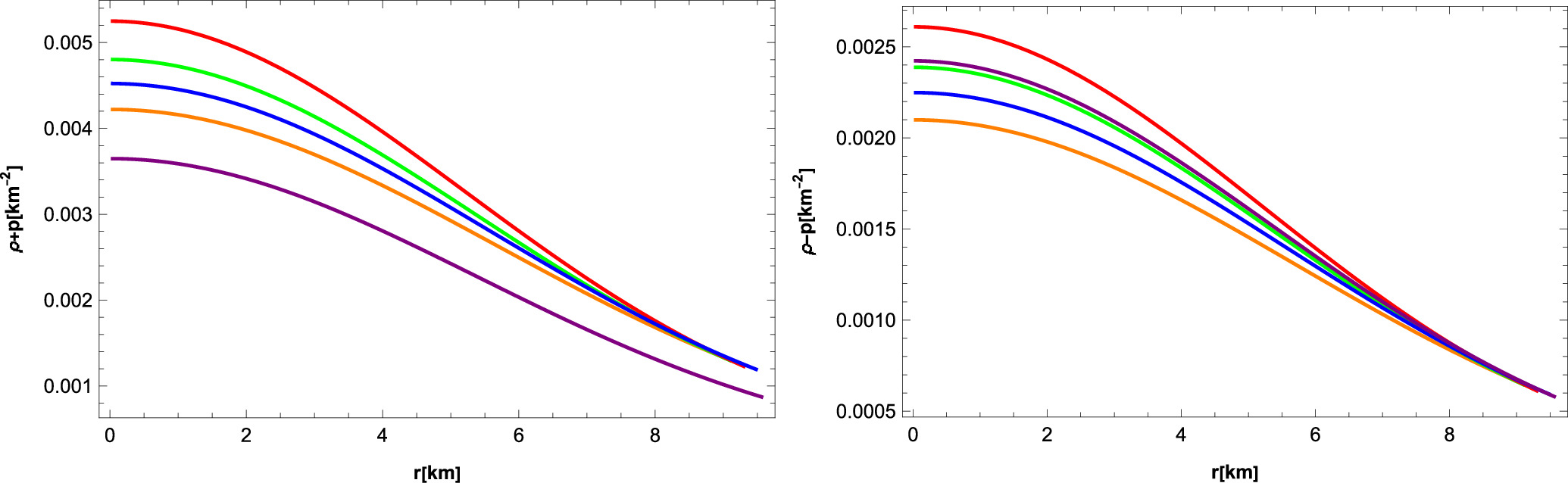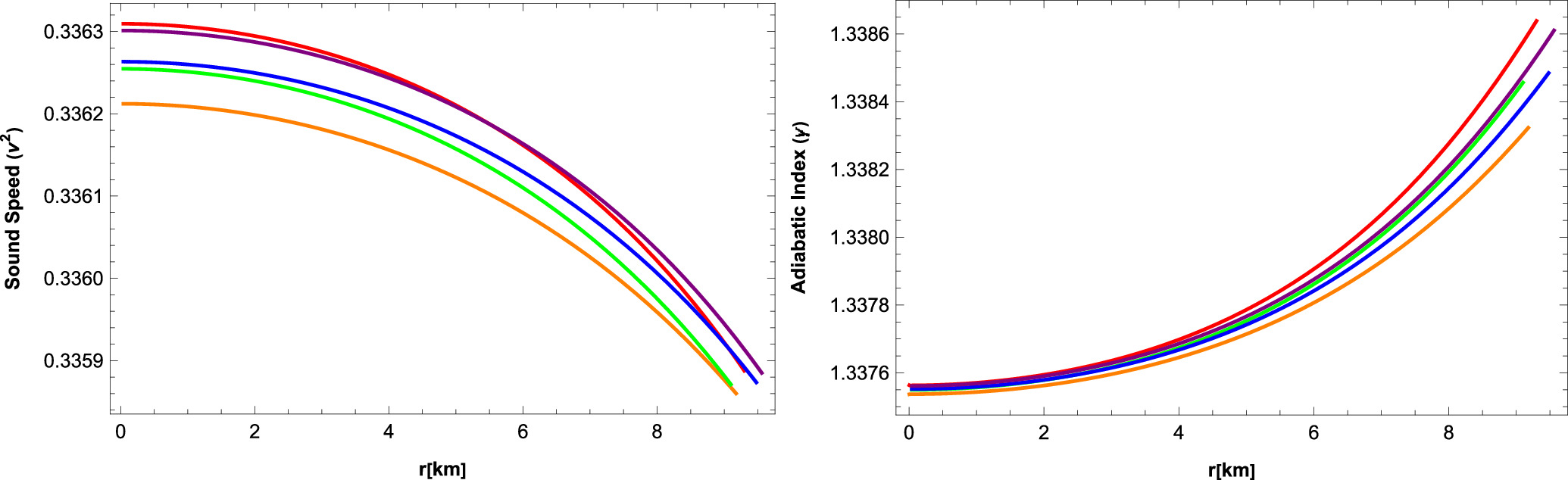 The graphical analysis of the adiabatic index, γ, is presented in the right panel of figure 7. It is evident that all curves remain above 4/3, indicating that the solutions with γ > 4/3 satisfy the stability criteria based on the adiabatic index, as outlined by Herrera [119]. This result supports the stability argument within the framework of GR.