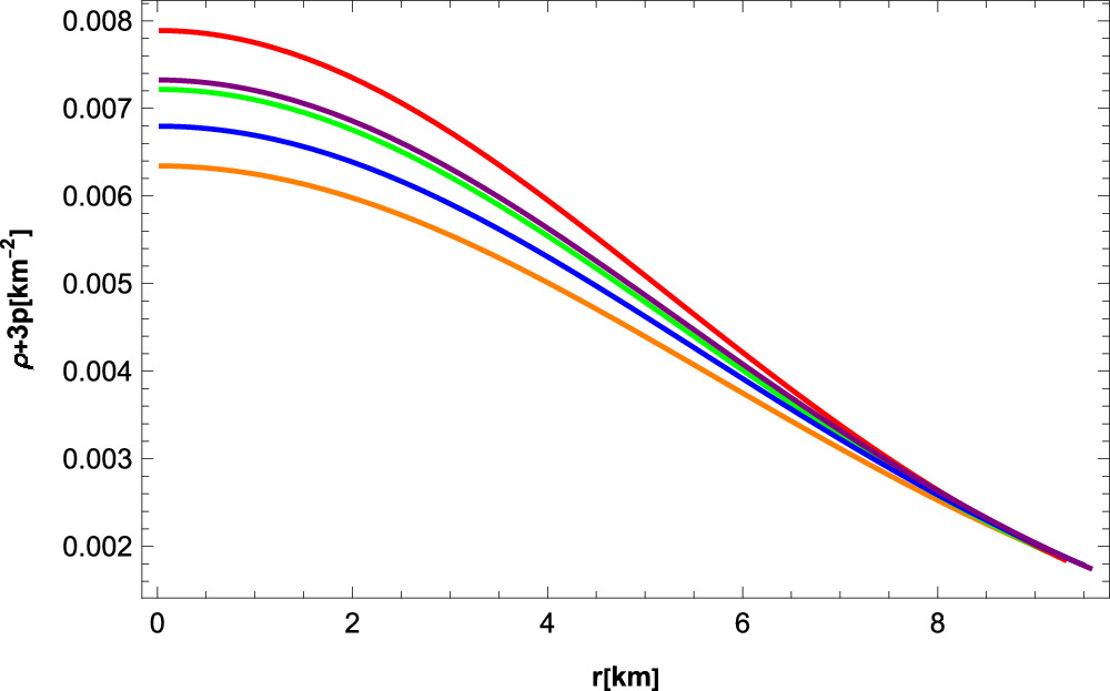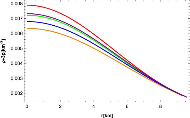 The graphical representation in figure 6 clearly demonstrates that 0 < ϖ < 1. These conditions confirm the viability of the compact stars within the framework of the assumed RGT model.