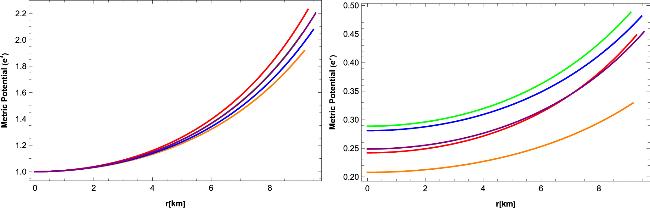 Figure 1. Plots of metric potentials (grr and gtt) from left to right for S1 (), S2 (), S3 (), S4 (), S5 ().