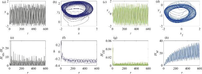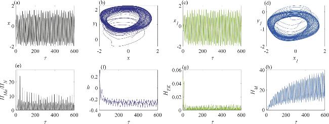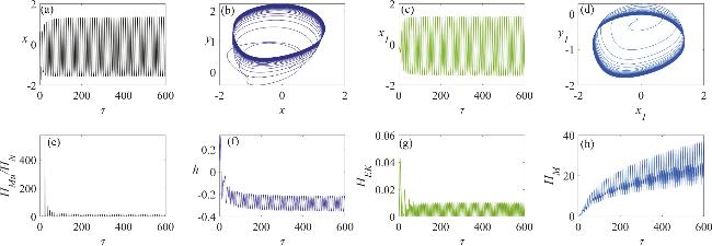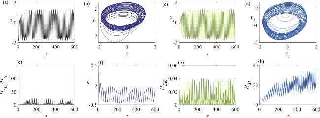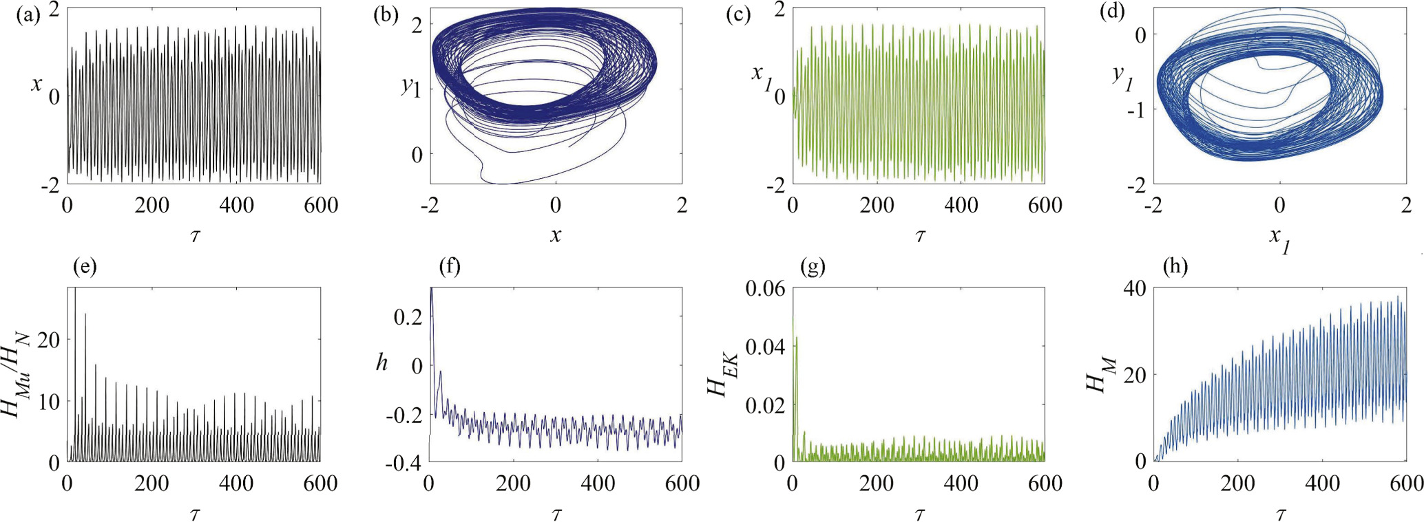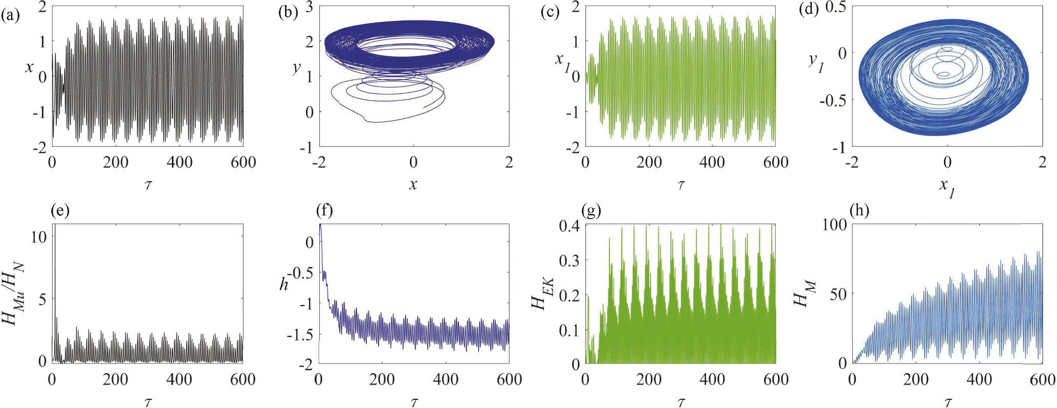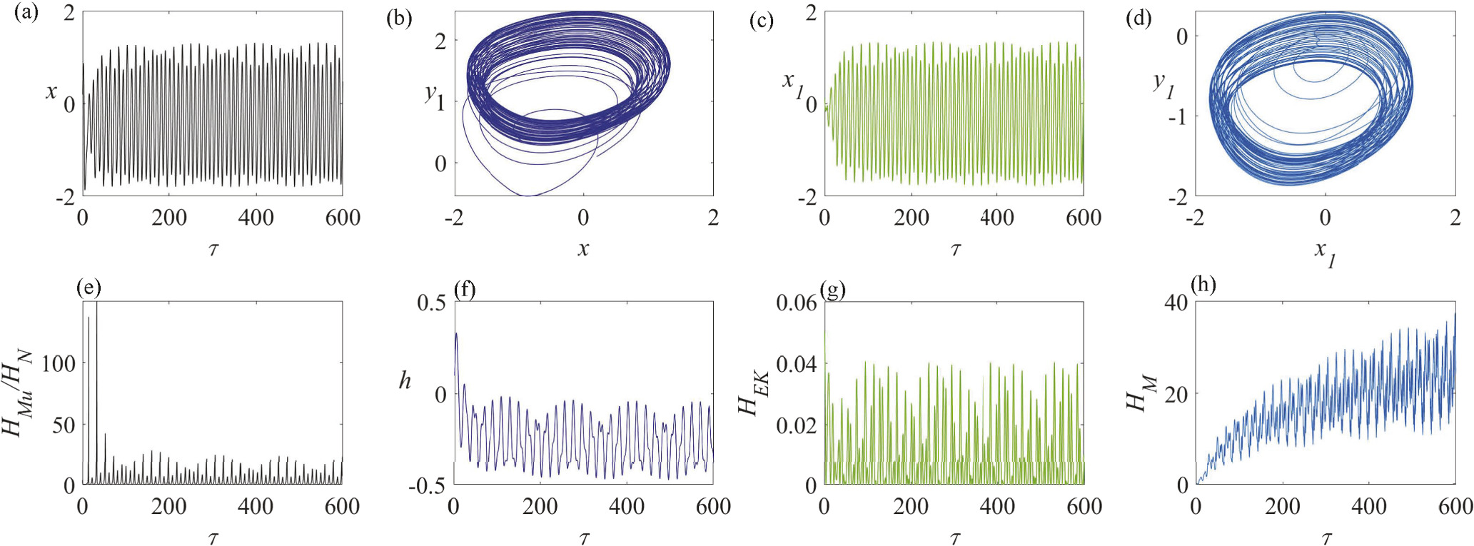 Figure 10. The chaotic firing state of a memristor synapse-coupled system involving a neuron and a skeletal muscle cell: (a) the membrane potential of the neuron; (b) the attractor of the neuron circuit; (c) the membrane potential of the skeletal muscle cell; (d) the attractor of the skeletal muscle cell circuit; (e) the temporal evolution of the Hamiltonian energy ratio between the skeletal muscle cell and the neuron; (f) the temporal evolution of the displacement of the active beam; (g) the temporal evolution of the kinetic energy of the active beam; (h) the temporal evolution of the field energy in the memristor-coupled channel. The parameter values are set to γ = 1.0, η1 = 2.0. |