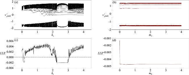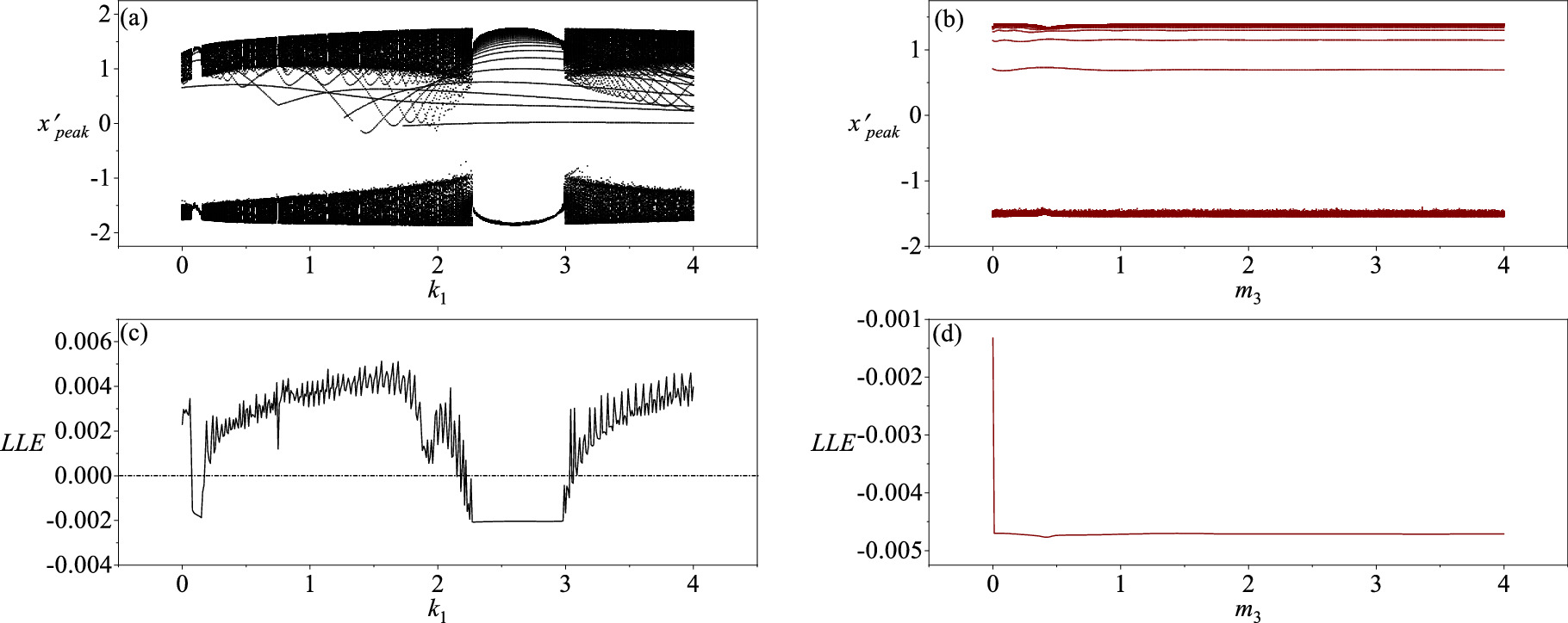 Figure 11. The bifurcation diagrams and Lyapunov exponents for the variable direction parameters k1 and m3 when a memristor synapse couples a neuron and a skeletal muscle cell. The parameters corresponding to the figures are: (a, c) m3 = 0.1; (b, d) k1 = 0.1; with a = 0.7, b = 0.3, c = 0.4, ξ = 0.175, I0 = 0.1, A = 0.4, λM = 0.1, α = 0.1, β = 0.1, γ = 3.2, η1 = 0.4, η2 = 0.12, k2 = 0.1, k3 = 0.1, m1 = 0.1, m2 = 0.1, ω = 1.3. The initial conditions of the system are (0.2, 0.1, 0, 0.1, 0.1, 0.1, 0.1, 0.1). |