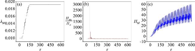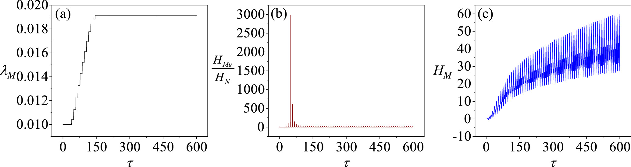Figure 13. The evolution of coupling strength, the energy ratio between skeletal muscle cells and neurons, and the field energy in the coupling channel over time when the coupling strength is adaptively regulated. The parameters are selected as: a = 0.7, b = 0.3, c = 0.4, ξ = 0.175, I0 = 0.1, A = 0.4, α = 0.1, β = 0.1, γ = 1, η1 = 0.4, η2 = 0.12, k1 = 0.1, k2 = 0.1, k3 = 0.1, m1 = 0.1, m2 = 0.1, m3 = 0.1, m4 = 1, m5 = 0.1, σ = 0.1, ϵ = 25. The initial conditions are (0.2, 0.1, 0, 0.1, 0.1, 0.1, 0.1, 0.1). The initial value of the coupling strength λM(0) is 0.01. |