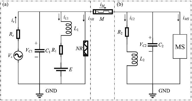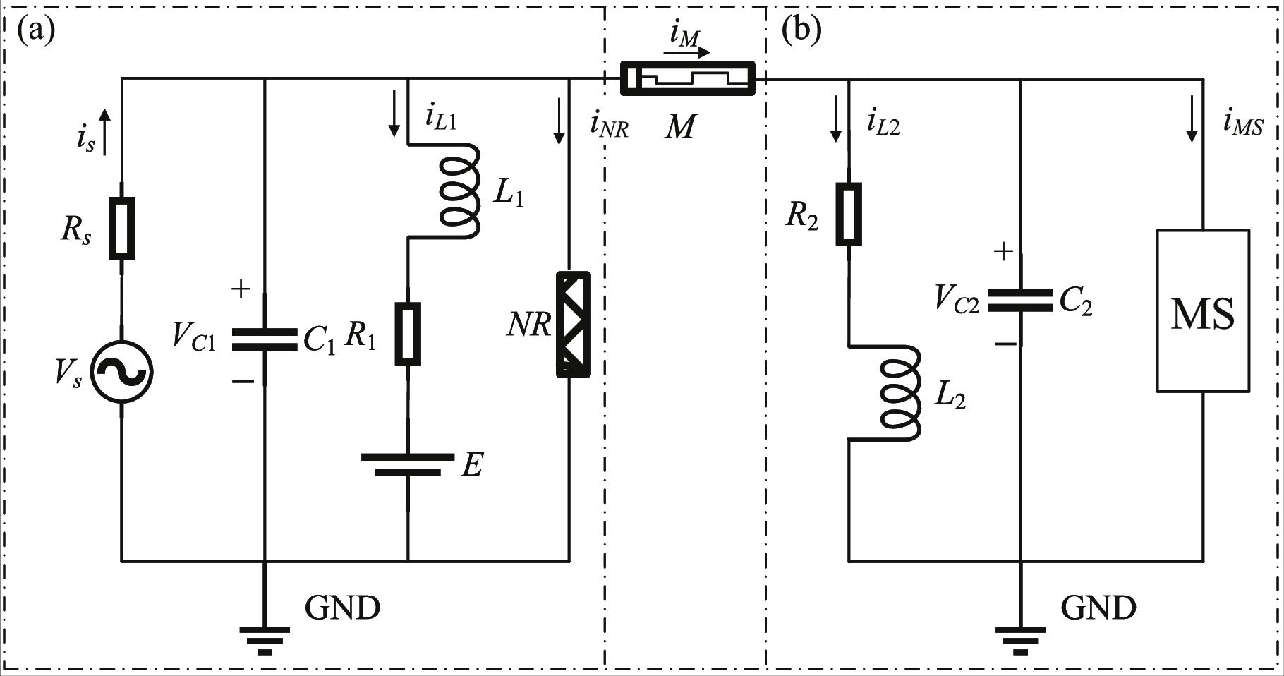 Figure 1. Equivalent circuit diagram of (a) neuron and (b) skeletal muscle cell connected by memristive synapses. |
