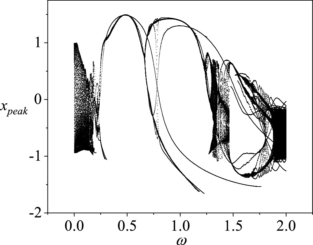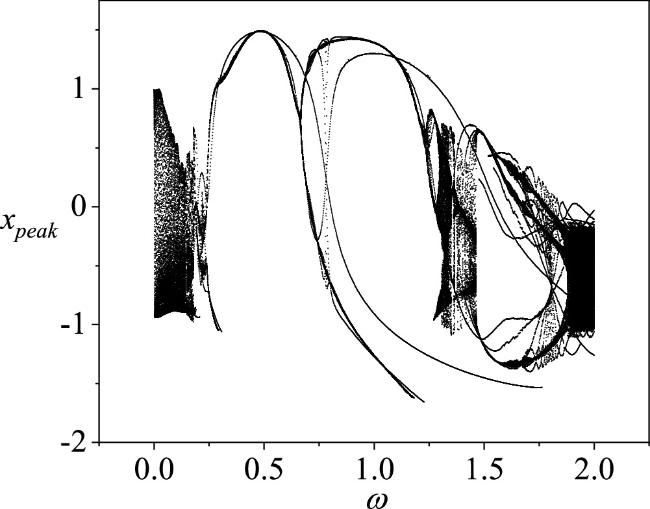 Figure 3. A bifurcation diagram of the membrane potential of a single neuron as the angular frequency ω varies, with the amplitude A set to 0.4. The parameters are chosen as a = 0.7, b = 0.3, c = 0.4, ξ = 0.175, I0 = 0.1. The initial conditions for the single neuron circuit are (0.2, 0.1). |